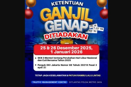 Pemerintah Provinsi DKI Jakarta melalui Dinas Perhubungan mengumumkan bahwa aturan ganjil genap di wilayah Ibu Kota tidak akan diberlakukan selama periode libur Natal dan cuti bersama pada Kamis, 25 D...